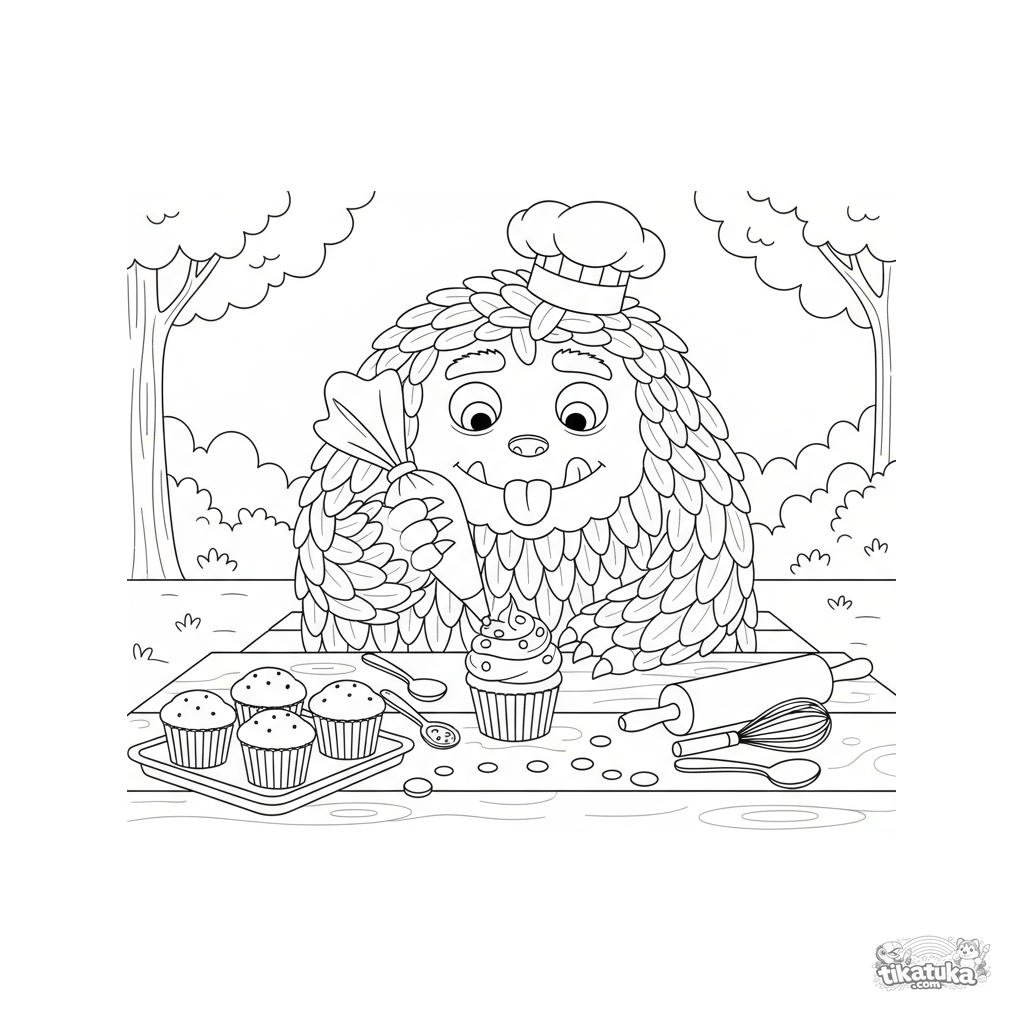 Сложная раскраска для детей 10-12 лет: пушистый монстр в колпаке шеф-повара тщательно украшает кекс на пикнике. Много деталей: инструменты, посыпка, текстуры.