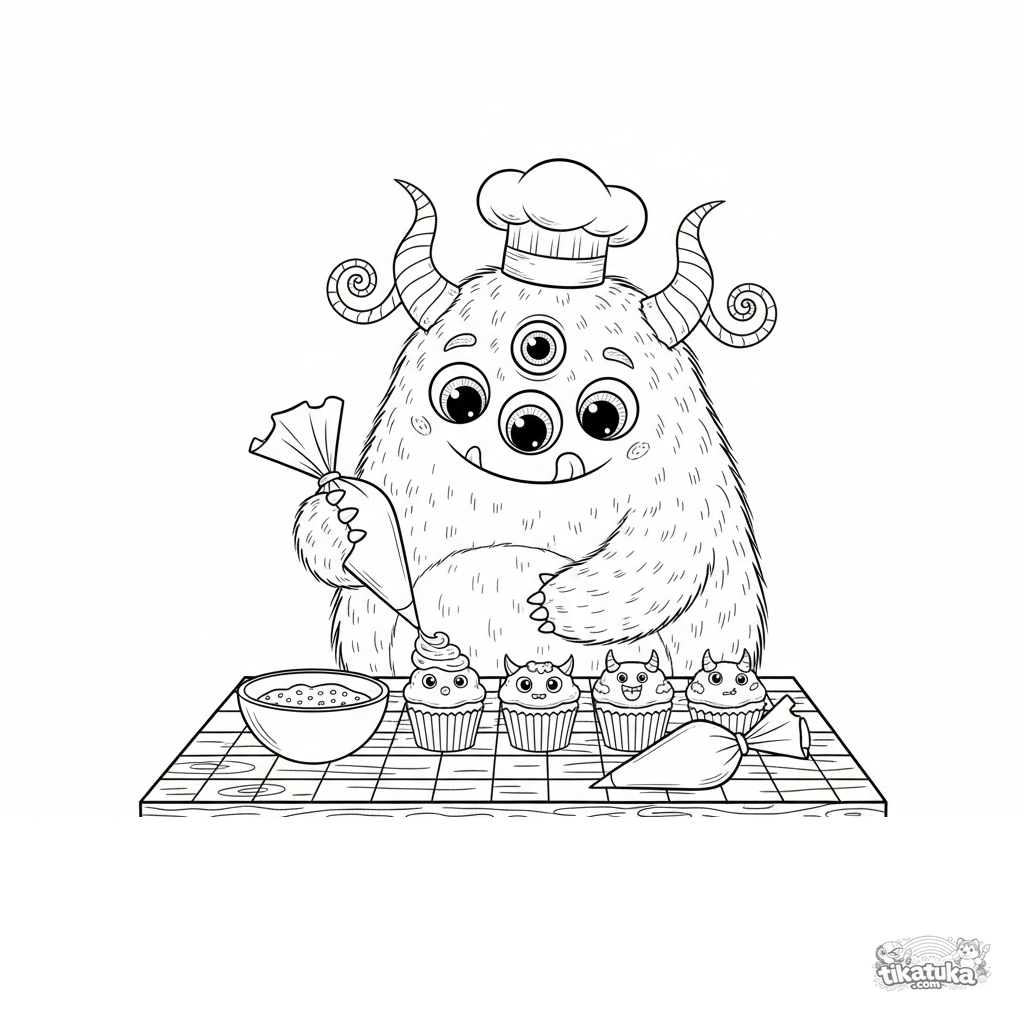 Детализированная раскраска для детей 10-12 лет: пушистый монстр в колпаке кондитера украшает кексы на пикнике. Реалистичные пропорции, высокая детализация.