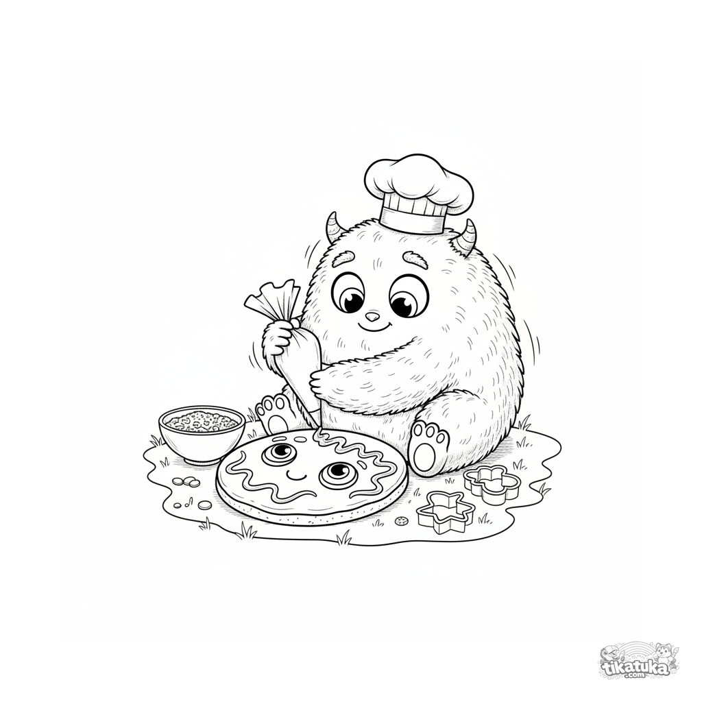 Детальная раскраска для детей 10-12 лет: пушистый монстр в колпаке шеф-повара украшает гигантское печенье на пикнике. Много текстур и интересных элементов.