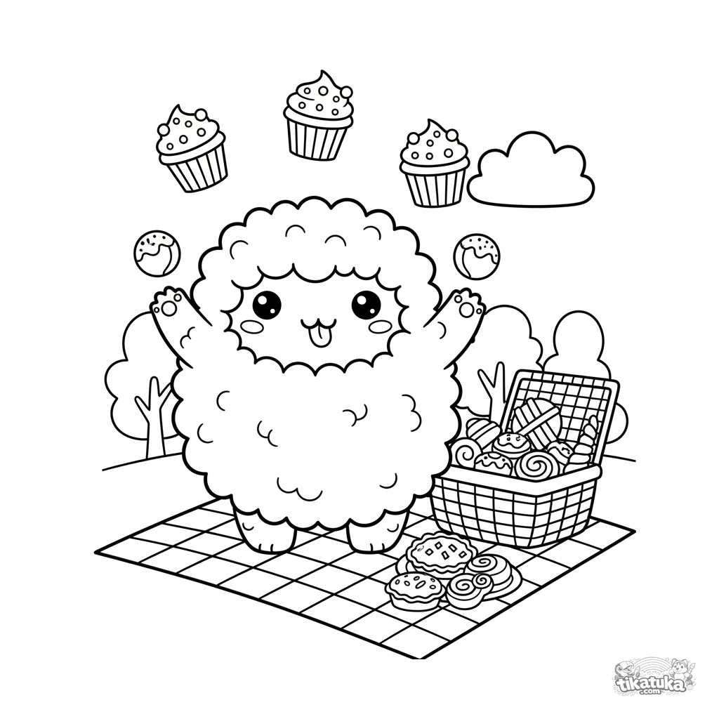Раскраска для детей 4-6 лет: пушистый монстр жонглирует кексами на пикнике. Веселая и динамичная сцена с понятными формами для раскрашивания.