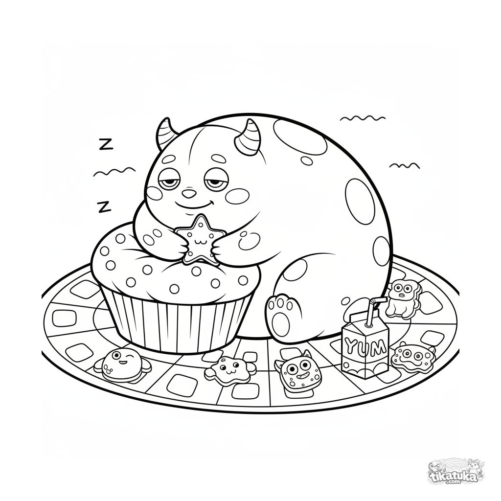 Раскраска для малышей: пушистый монстр сладко спит на подушке в виде кекса на пикнике. Крупные простые формы, для детей 2-3 лет.