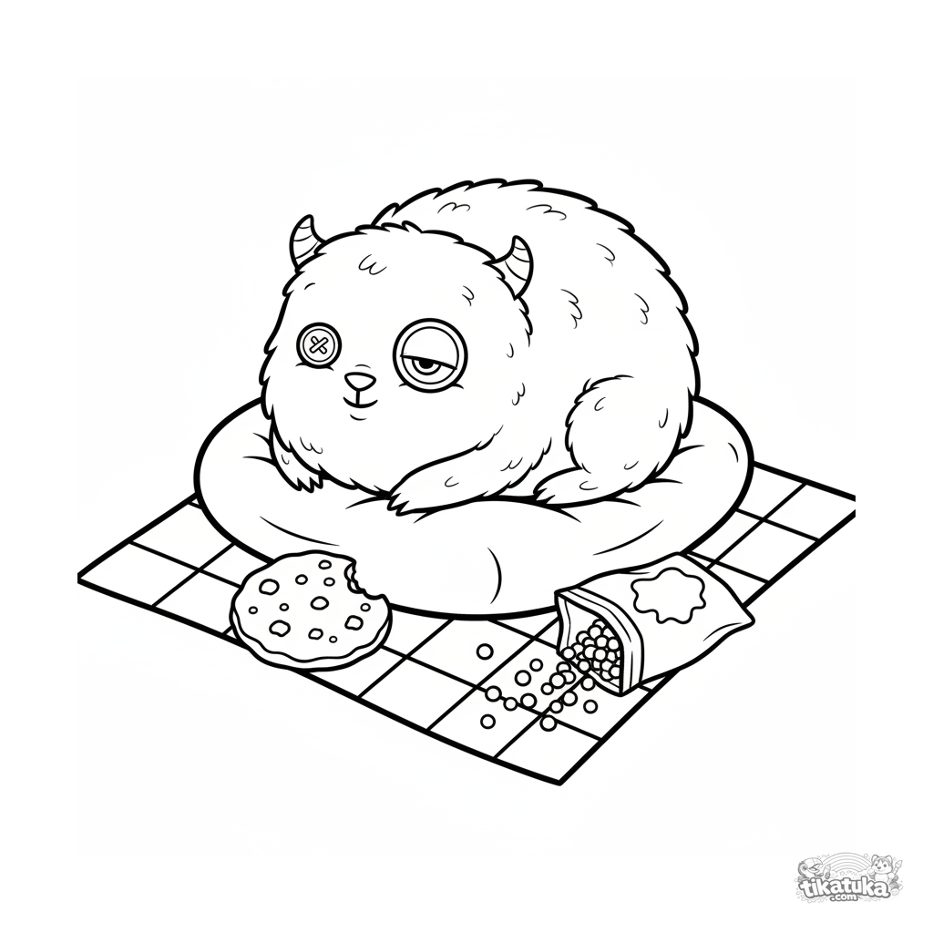 Раскраска для малышей 2-3 года: пушистый монстр сладко спит на зефирной подушке после пикника. Простые крупные формы, идеально для первых раскрасок.