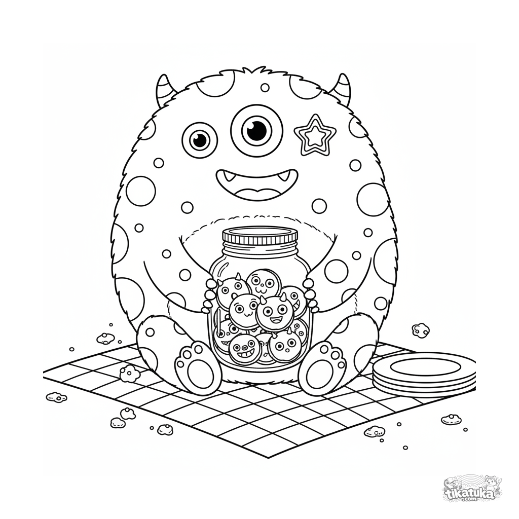 Раскраска для детей 4-6 лет: пушистый монстр с разными глазами предлагает банку с печеньем в виде монстриков на пикнике. Добрая сцена про дружбу и угощение.