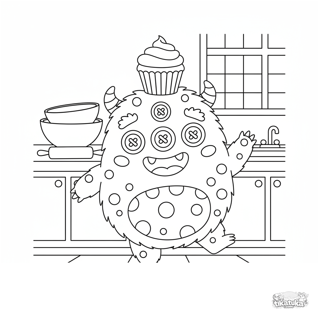 Раскраска для детей 4-6 лет: пушистый монстр с тремя глазами весело танцует с кексом на голове в маленькой кухне. Яркая сцена для раскрашивания.