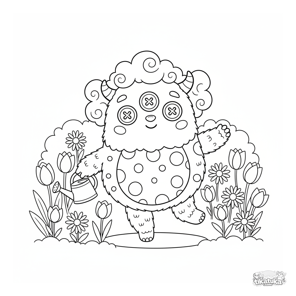 Раскраска для детей 4-6 лет: пушистый монстр с тремя глазами весело танцует с лейкой в цветочном саду. Яркая и добрая сцена.