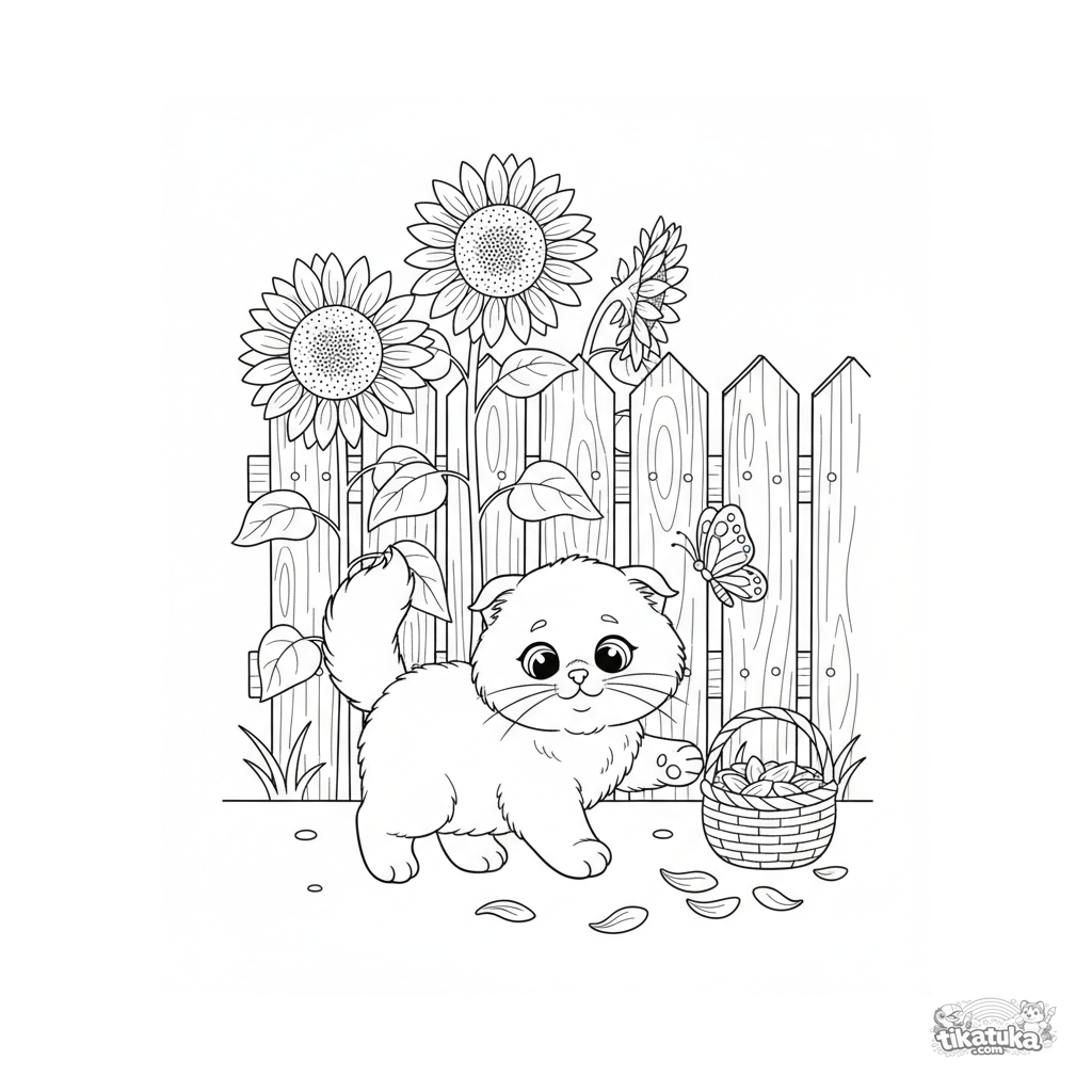 Раскраска для детей 4-6 лет: пушистый котёнок с загнутыми ушками весело гоняется за бабочкой среди высоких подсолнухов в саду.