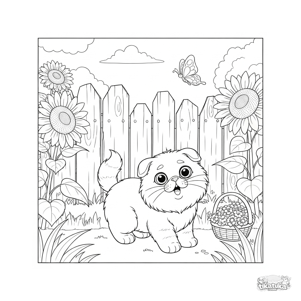 Раскраска с пушистым котёнком, который гоняется за бабочкой в поле подсолнухов. Для детей 3-6 лет. Милая сцена с забором и корзинкой.