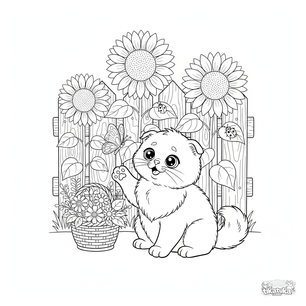 Раскраска с милым пушистым котёнком в саду среди гигантских подсолнухов. Для детей 3-6 лет. Котёнок с удивлённым выражением играет с бабочкой.