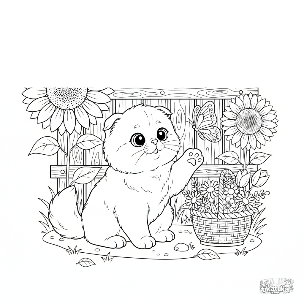 Раскраска для малышей 3-6 лет: пушистый котёнок с загнутыми ушками играет с бабочкой среди гигантских подсолнухов у старого деревянного забора.