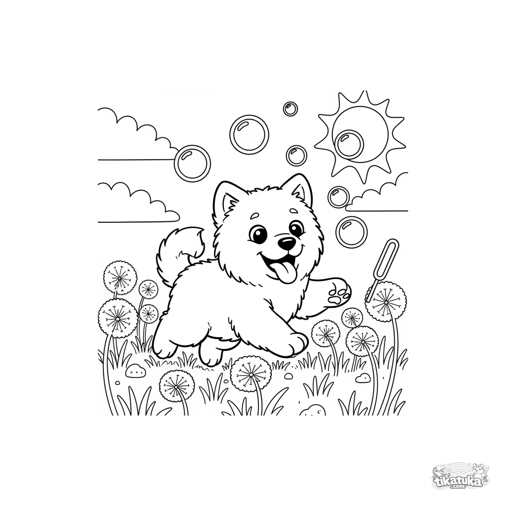 Раскраска с пушистым щенком самоеда, который весело ловит мыльные пузыри на лугу. Для детей 3-6 лет. Простые линии и милый сюжет.