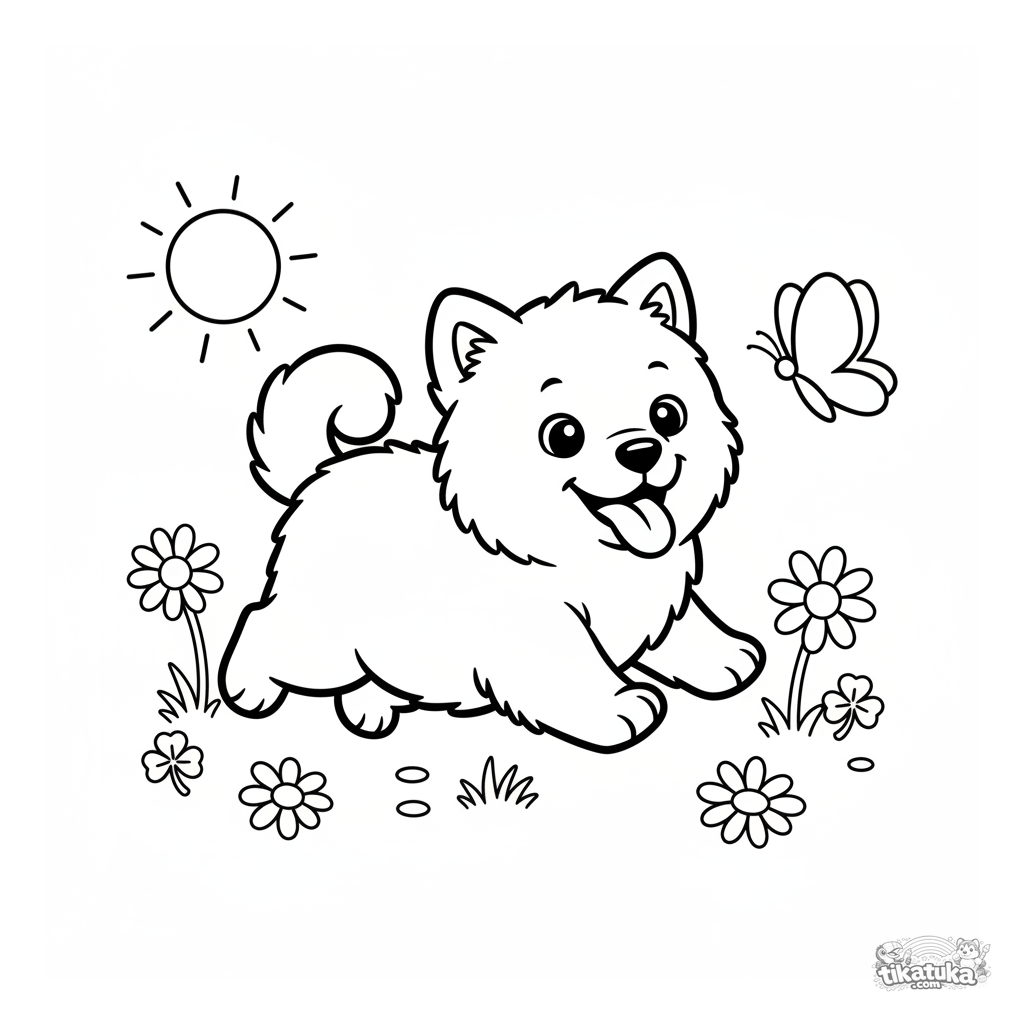 Раскраска для малышей: пушистый щенок самоеда весело бегает за бабочкой на лугу. Простые крупные формы, идеально для детей 2-3 лет.