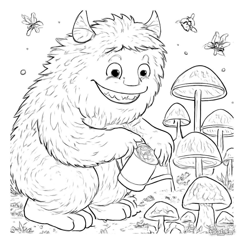 Сложная раскраска: пушистый монстр поливает волшебный сад светящихся грибов. Для детей 8-12 лет, с высоким уровнем детализации и реалистичной текстурой.