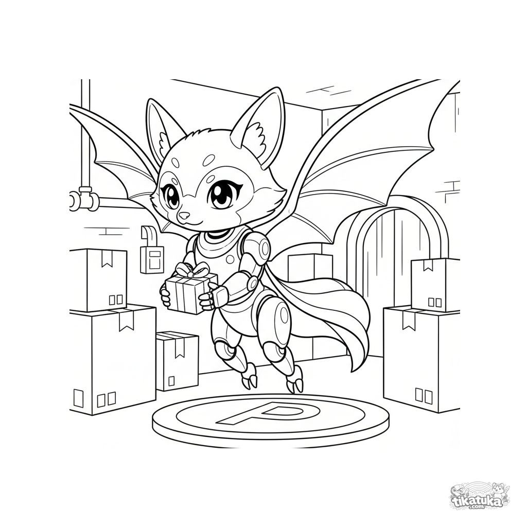 Раскраска робота-дрона в виде летучей лисицы, доставляющего посылку на склад. Для детей 7-9 лет, с динамичной позой и интересными деталями.