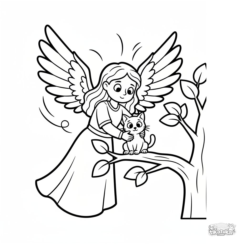 Простая раскраска для малышей 2-3 года: добрый летающий герой с перьевыми крыльями осторожно спасает котёнка с ветки дерева в парке.