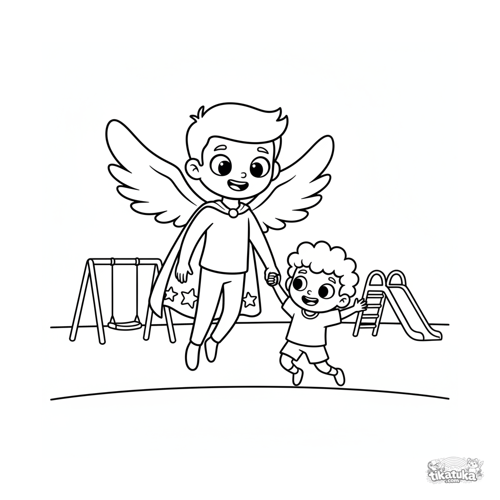 Простая раскраска для малышей 2-3 лет: летающий супергерой с крыльями помогает ребёнку прыгать на школьной площадке.