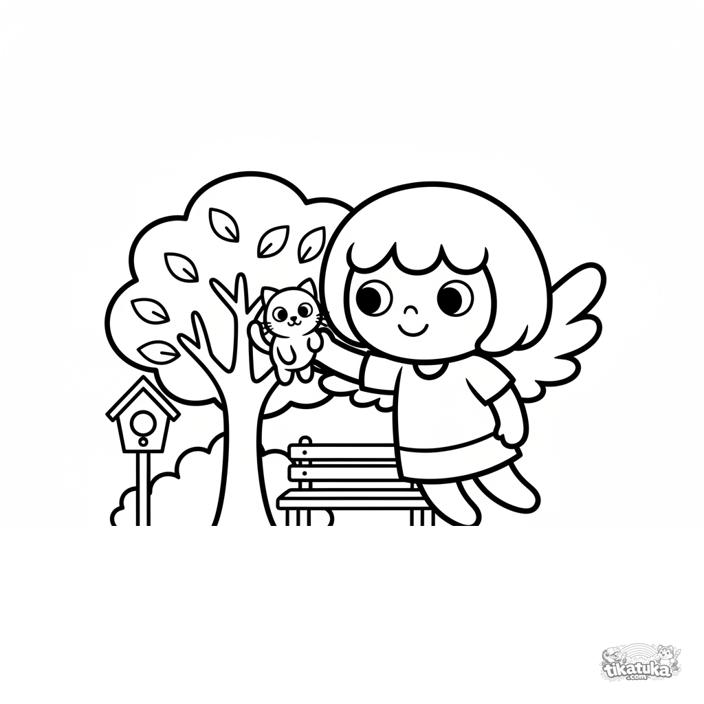 Простая раскраска для малышей 2-3 лет: добрый летающий герой с крыльями спасает котёнка с дерева в парке. Крупные фигуры и простые контуры.