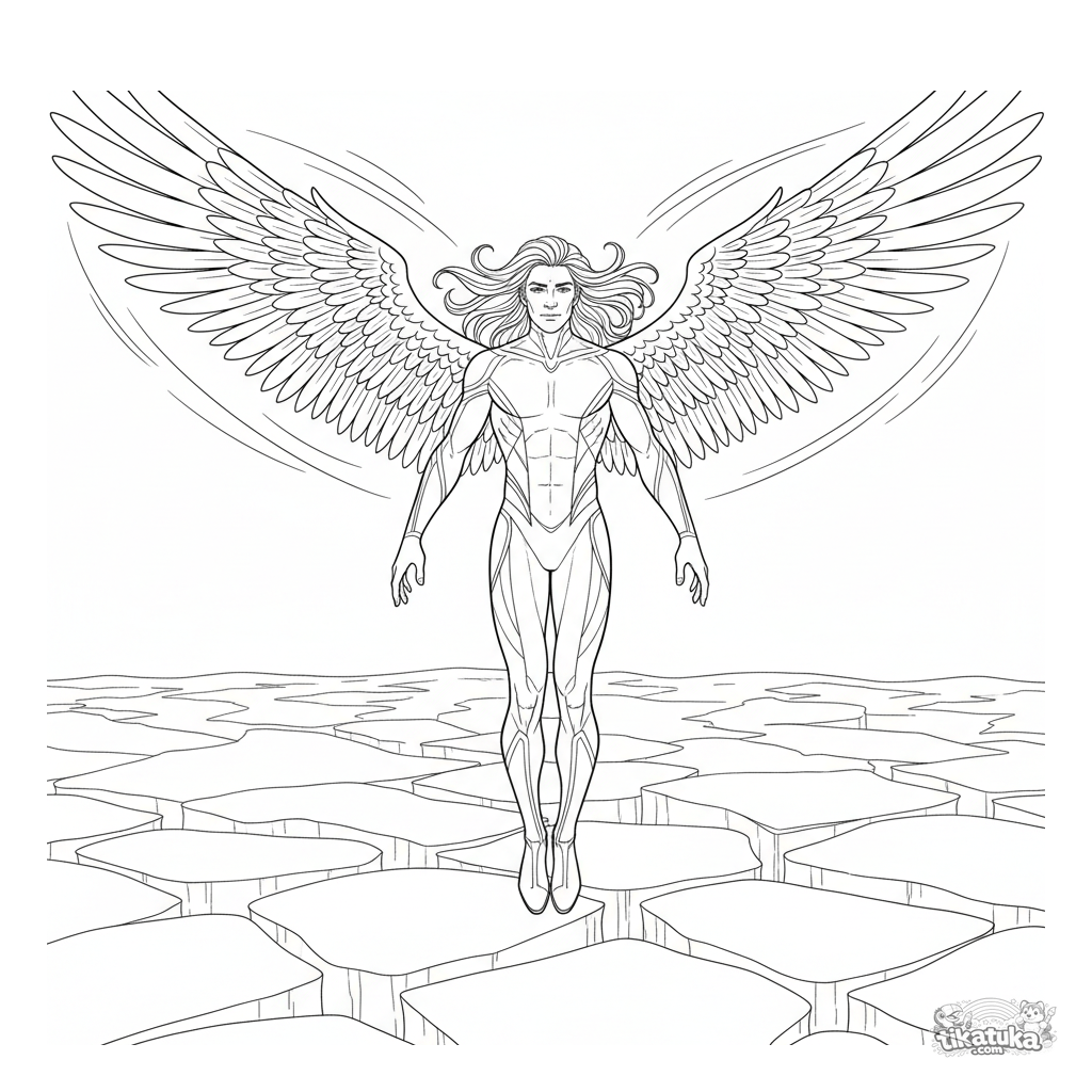 Раскраска для детей 10-12 лет: супергерой с большими перьевыми крыльями парит над величественным арктическим ледником, осматривая ледяной пейзаж.