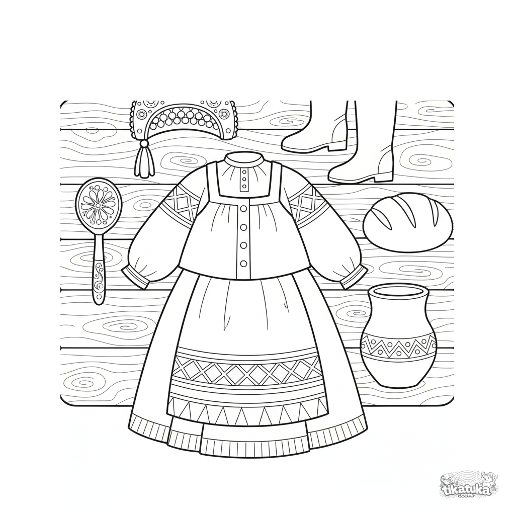Яркая раскраска в стиле русского лубка для 10-12 лет: традиционный сарафан с вышивкой и аксессуары, разложенные на деревенском столе с предметами быта.