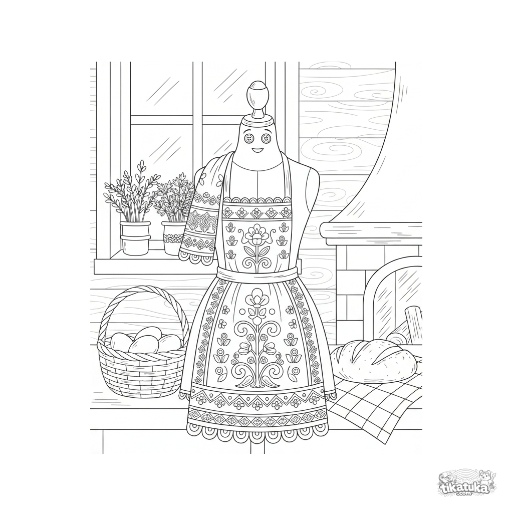 Раскраска для детей 10-12 лет: детализированный фартук с народной вышивкой на манекене в уютной деревенской кухне. С традиционными узорами и предметами быта.
