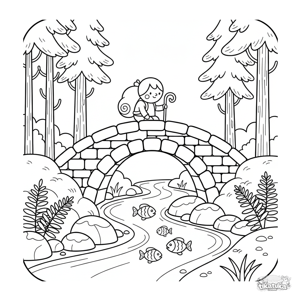 Раскраска в народном стиле лубок: арочный мост в лесу для детей 5-9 лет. Изображен мост через ручей, путешественник с посохом и сосны.