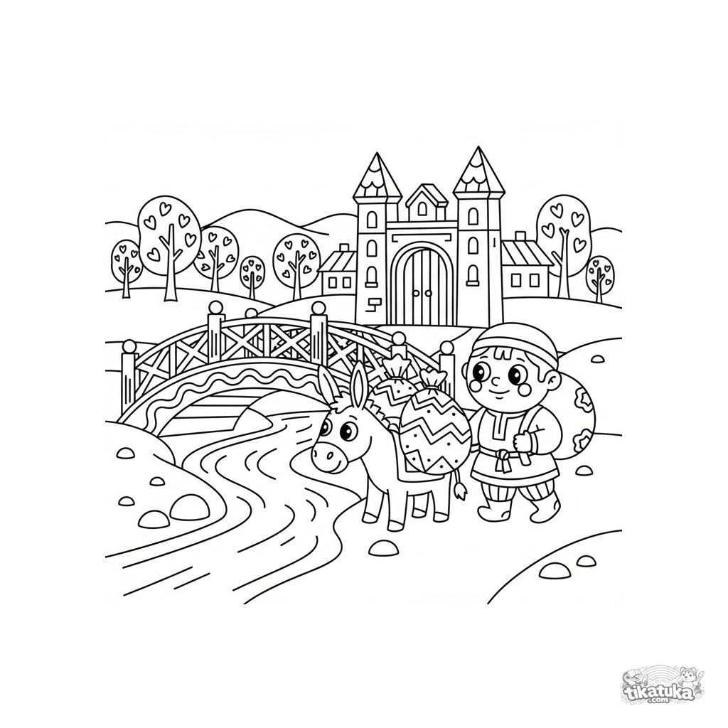 Раскраска для детей 4-6 лет: деревянный мост через речку, купец с осликом прибывает в деревню. Простые формы, чёткие линии, широкие поля для раскрашивания.