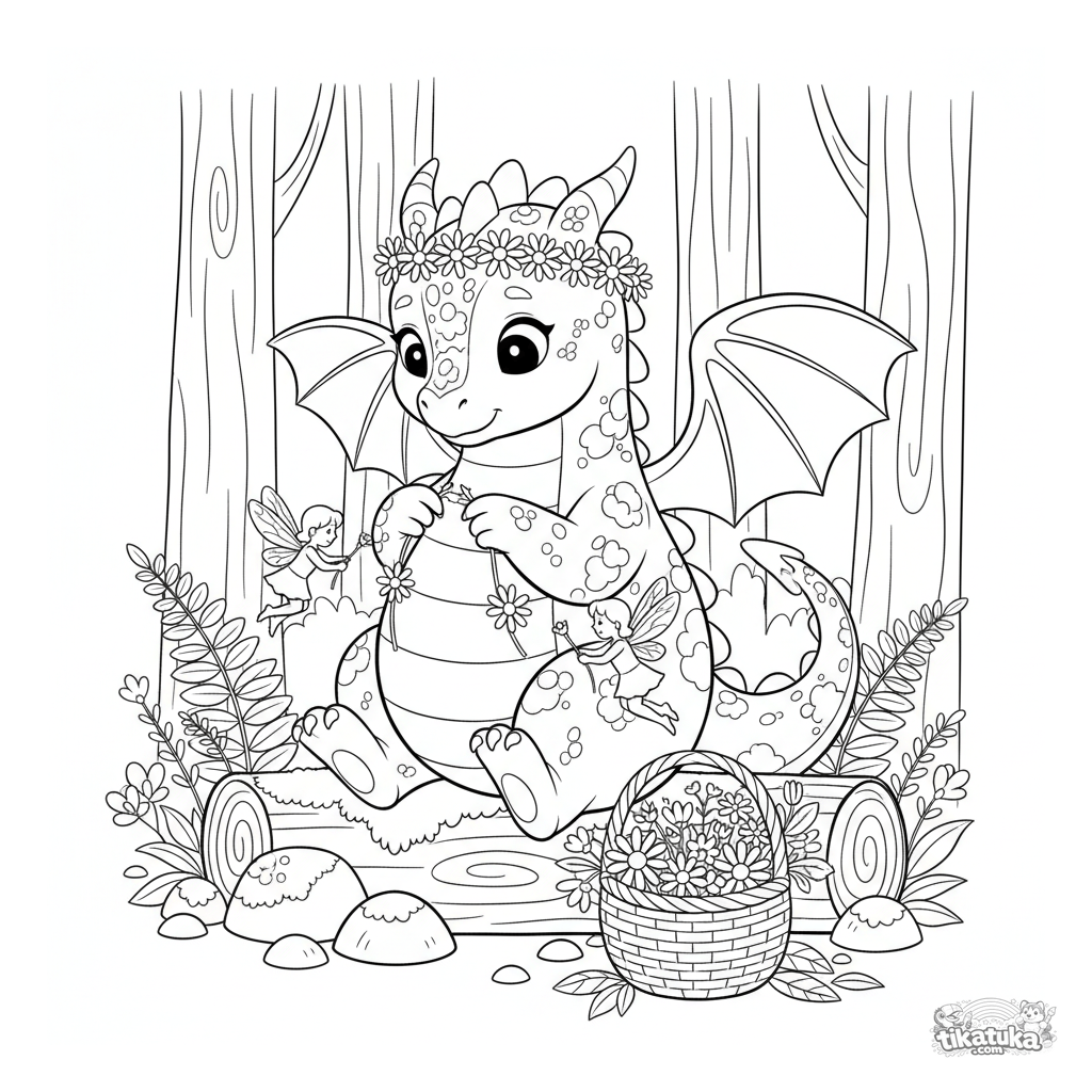 Раскраска для детей 4-6 лет: добрый лесной дракон с феями плетёт цветочные венки на пне в волшебном лесу.