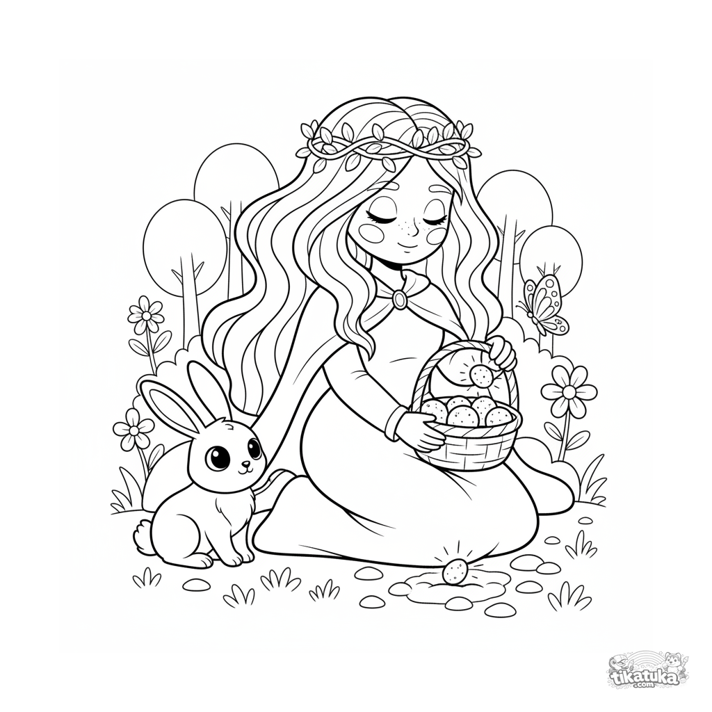 Раскраска для детей 4-6 лет: лесная принцесса сажает волшебные семена на лугу с кроликом и бабочкой. Спокойная и добрая сцена.