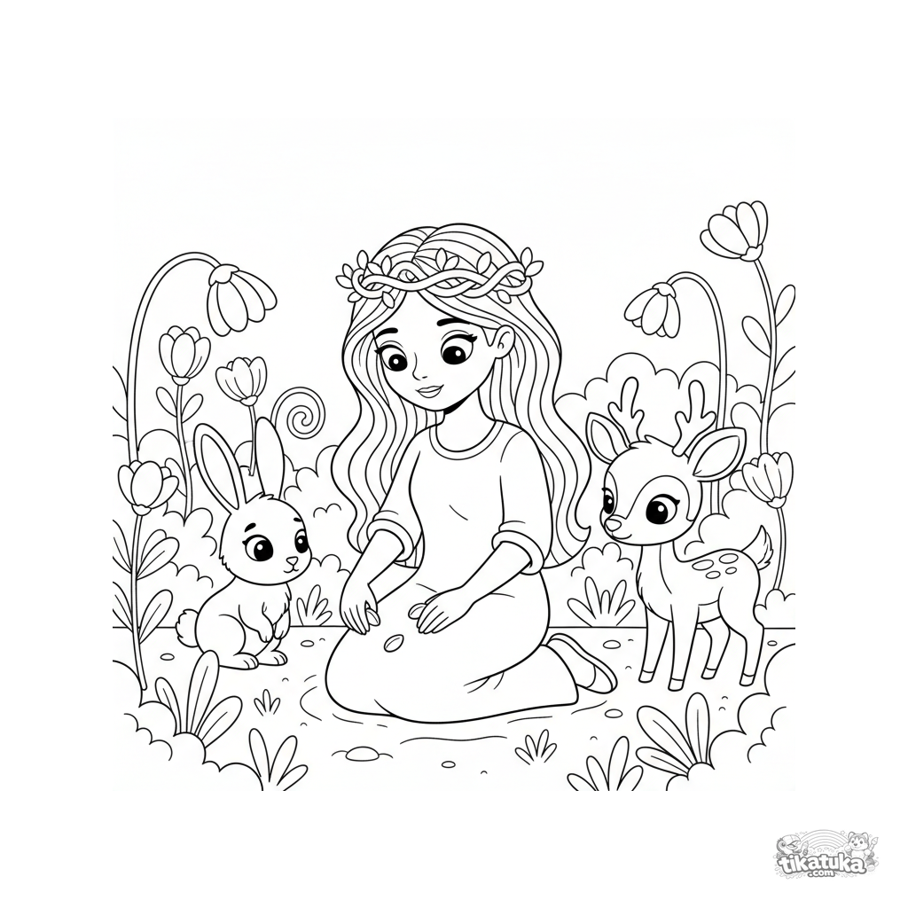 Раскраска для детей 4-6 лет: лесная принцесса сажает волшебные семена в зачарованном саду, рядом кролик и оленёнок.