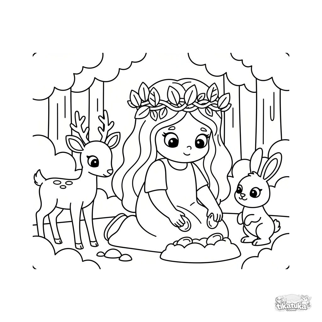 Простая раскраска для малышей 2-3 лет: лесная принцесса с венком сажает волшебные семена в сказочной роще, ей помогают кролик и олень.