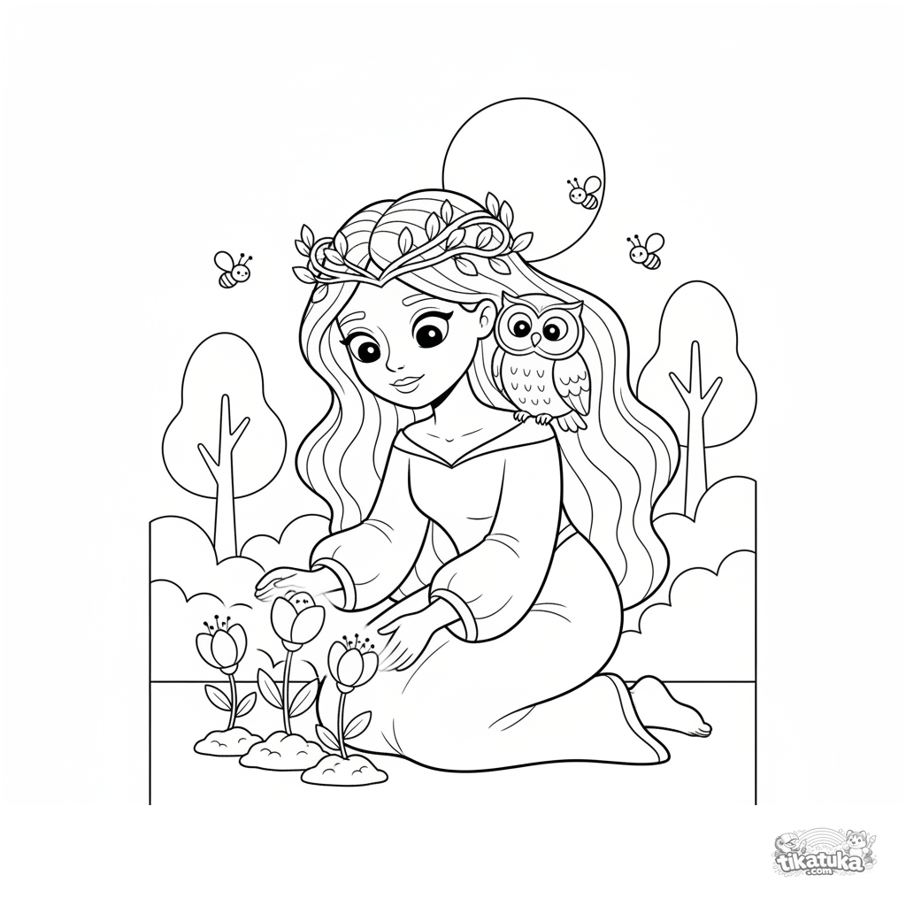 Раскраска для детей 4-6 лет: лесная принцесса сажает волшебные цветы при лунном свете. С ней сова и светлячки. Милая и спокойная сцена для творчества.