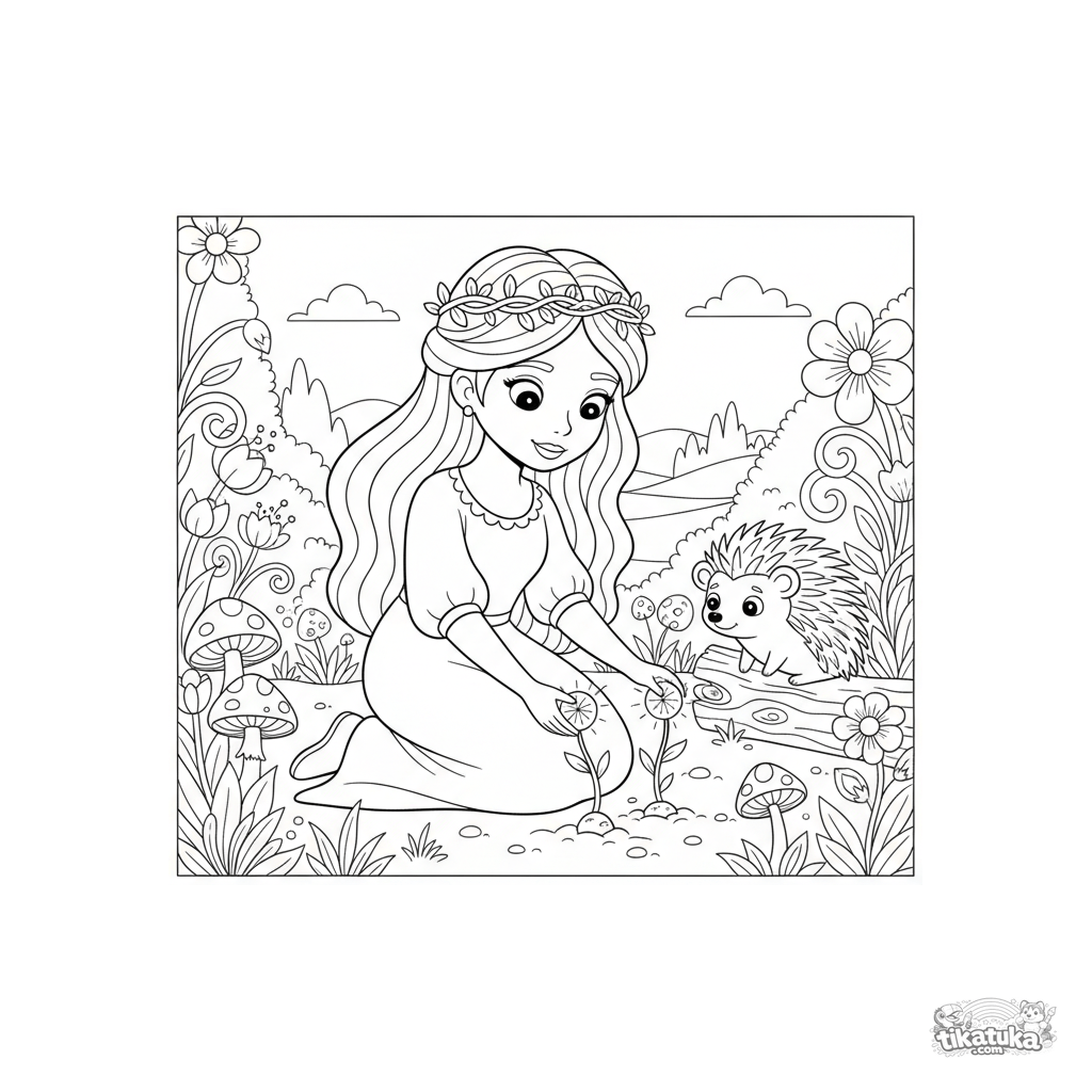 Раскраска для детей 4-6 лет: лесная принцесса сажает волшебные цветы в зачарованном саду. Милая сцена с ёжиком.