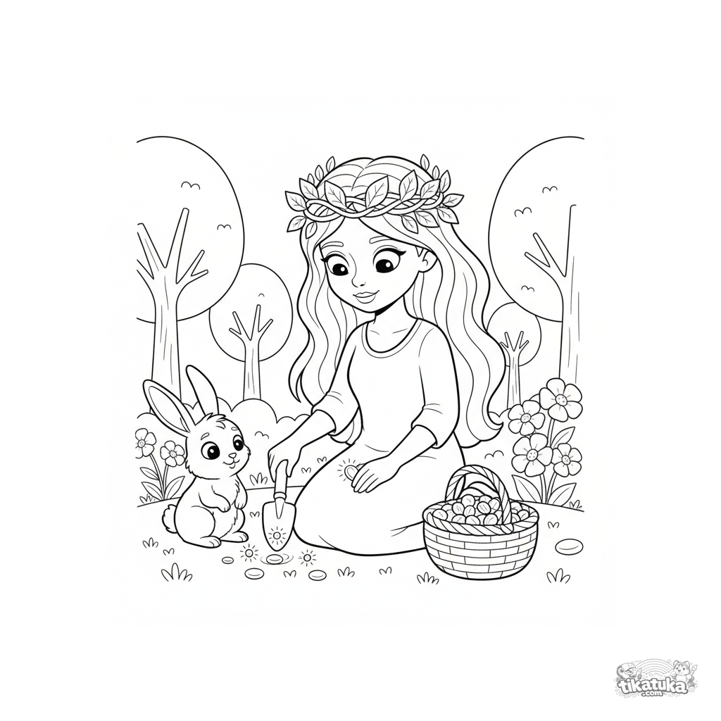 Раскраска для детей 4-6 лет: лесная принцесса сажает волшебные цветы в сказочном саду. Милый кролик помогает ей. Простые четкие контуры.