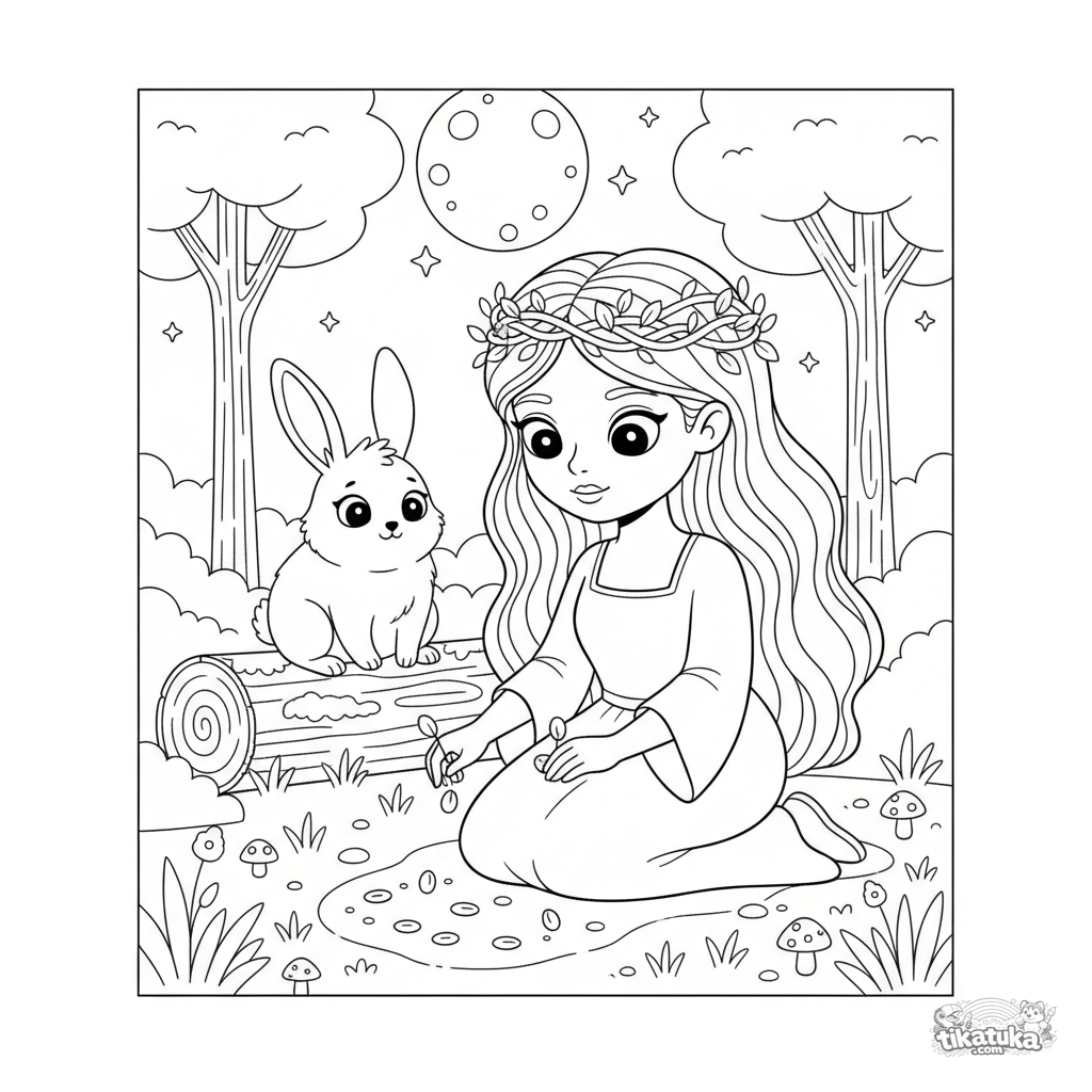 Раскраска для детей 4-6 лет: лесная принцесса сажает волшебные лунные цветы в зачарованном саду при свете луны, рядом смотрит кролик.