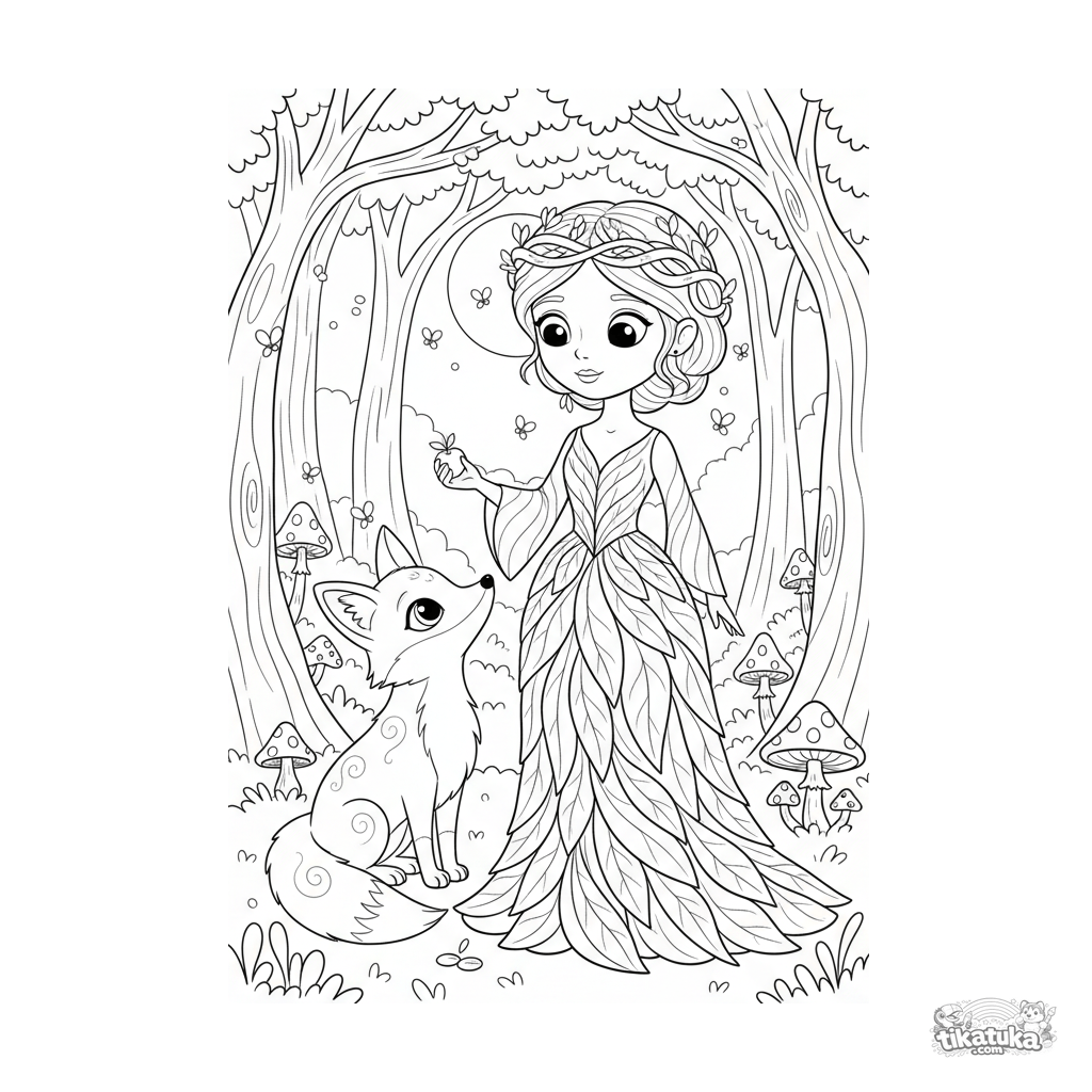 Раскраска для детей 7-9 лет: лесная принцесса в лунной роще дружит со светящейся лисой среди волшебных грибов и светлячков.
