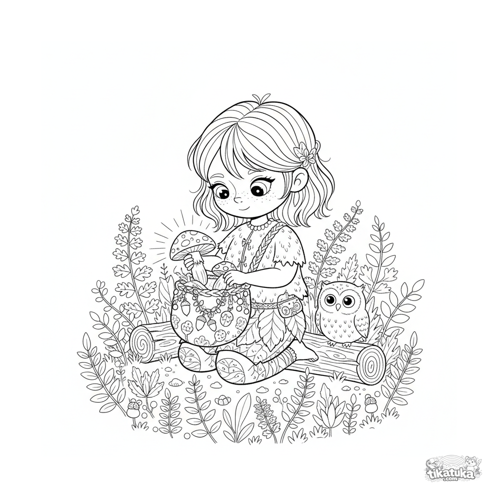 Сказочная раскраска для детей 10-12 лет: лесная фея в приключенческом костюме собирает грибы в волшебном лесу, рядом с ней сидит сова.