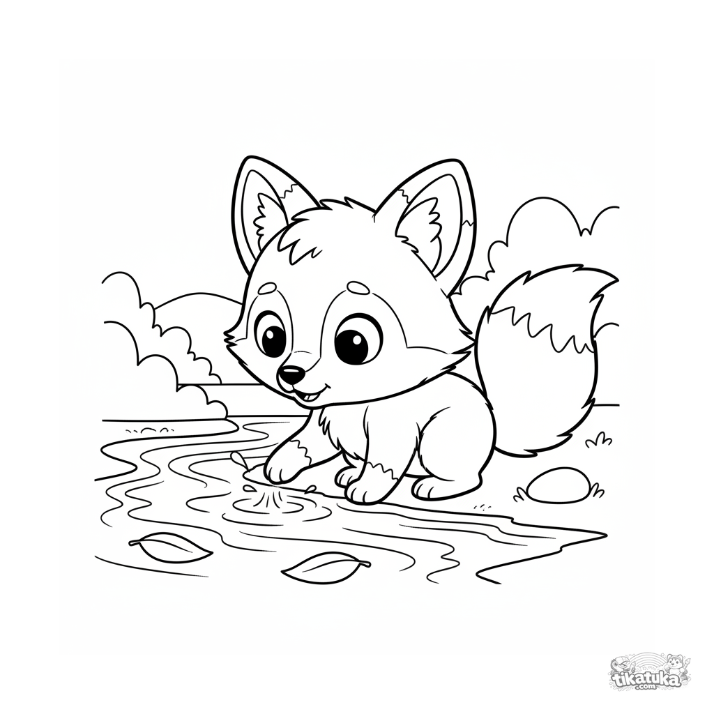 Раскраска для детей 7-9 лет: любопытный лисёнок осторожно трогает лапкой воду у берега прозрачного ручья. Выразительная сцена в классическом мультяшном стиле.