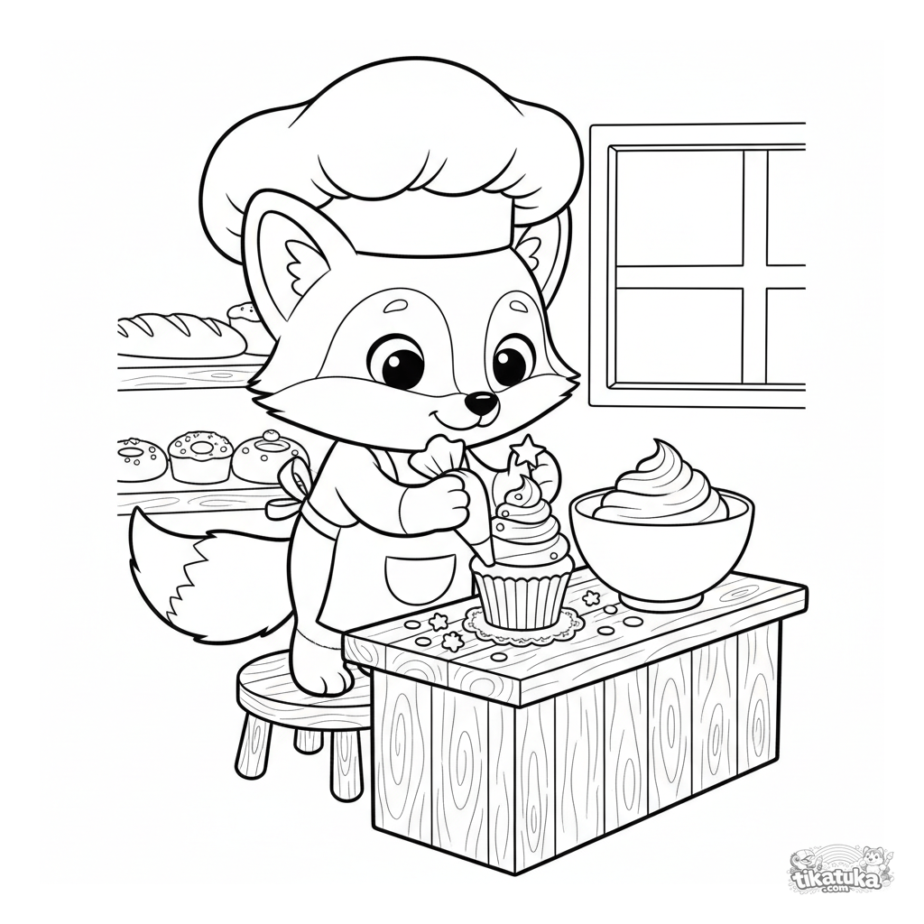 Раскраска для детей 3-7 лет: лис Фокси в колпаке пекаря украшает вкусный кекс глазурью. Милая и простая сцена в пекарне для раскрашивания.