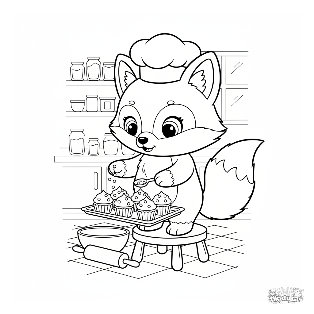 Раскраска для детей 4-6 лет: лисёнок-детектив Фокси в уютной кухне печёт кексы. Чистые линии, милый скандинавский стиль, широкие поля для раскрашивания.