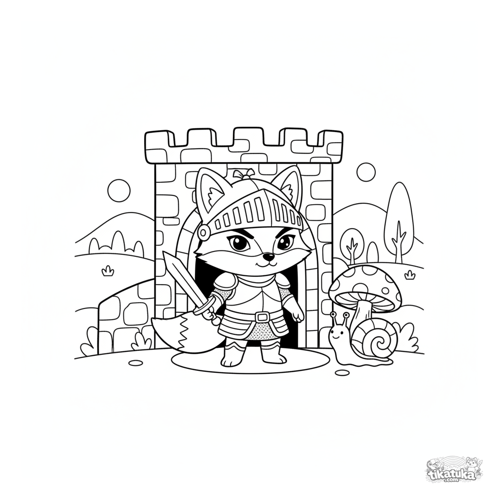 Раскраска для мальчиков 4-8 лет: лис Фокси в рыцарских доспехах стоит на страже у ворот игрушечного замка. Простые формы и добрый сюжет для раскрашивания.