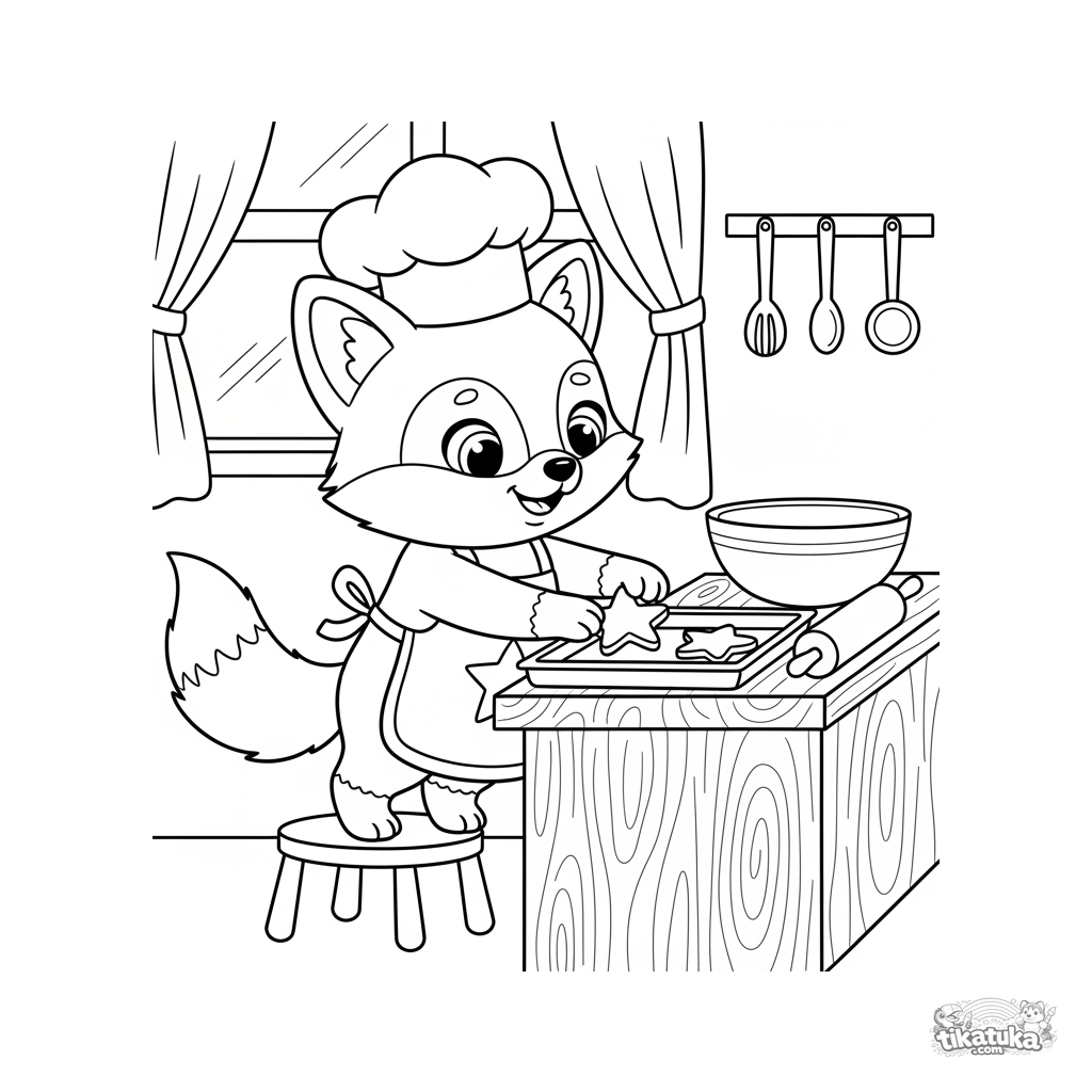 Раскраска для детей 4-6 лет: лис Фокси в роли пекаря готовит печенье на уютной кухне. Мягкий плюшевый стиль, простые детали.