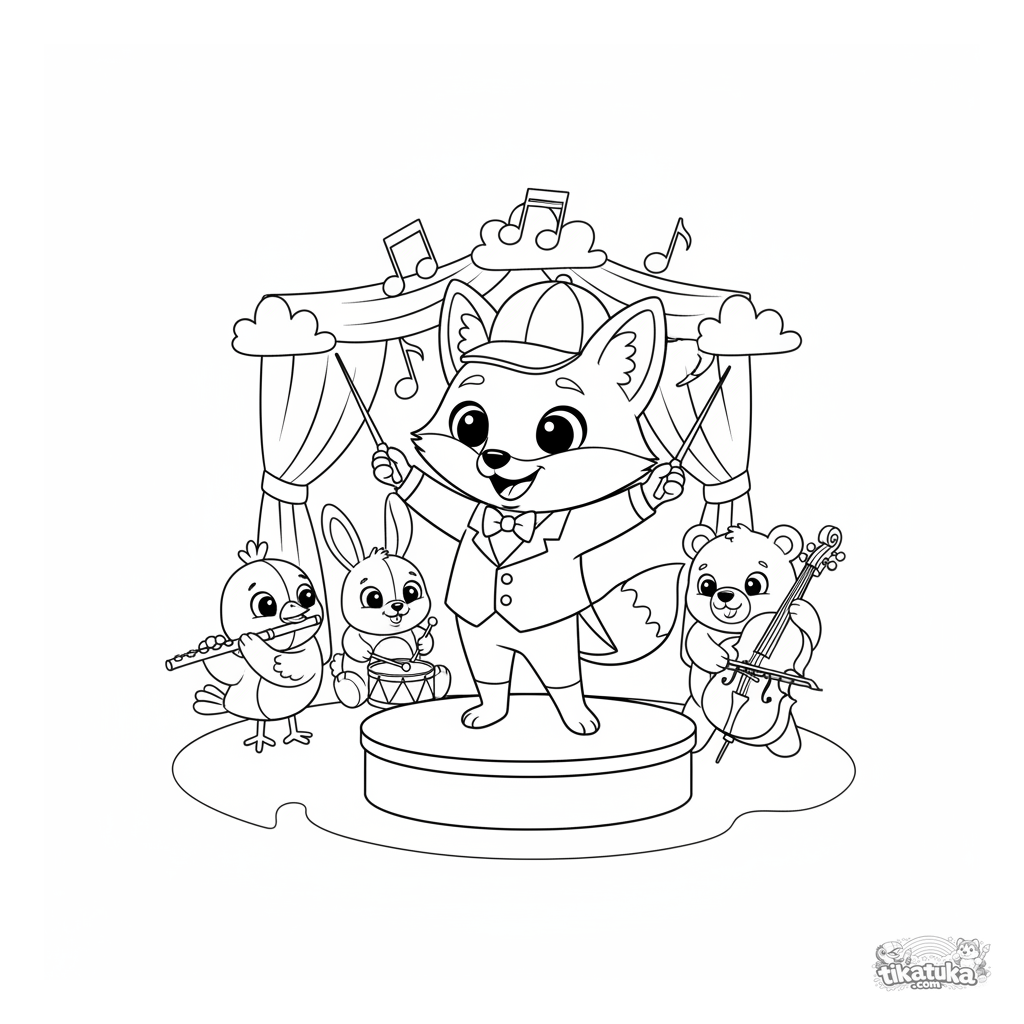 Раскраска для детей 4-6 лет: лис Фокси дирижирует маленьким игрушечным оркестром из зверят. Стиль мягкой куклы, весёлые нотки.