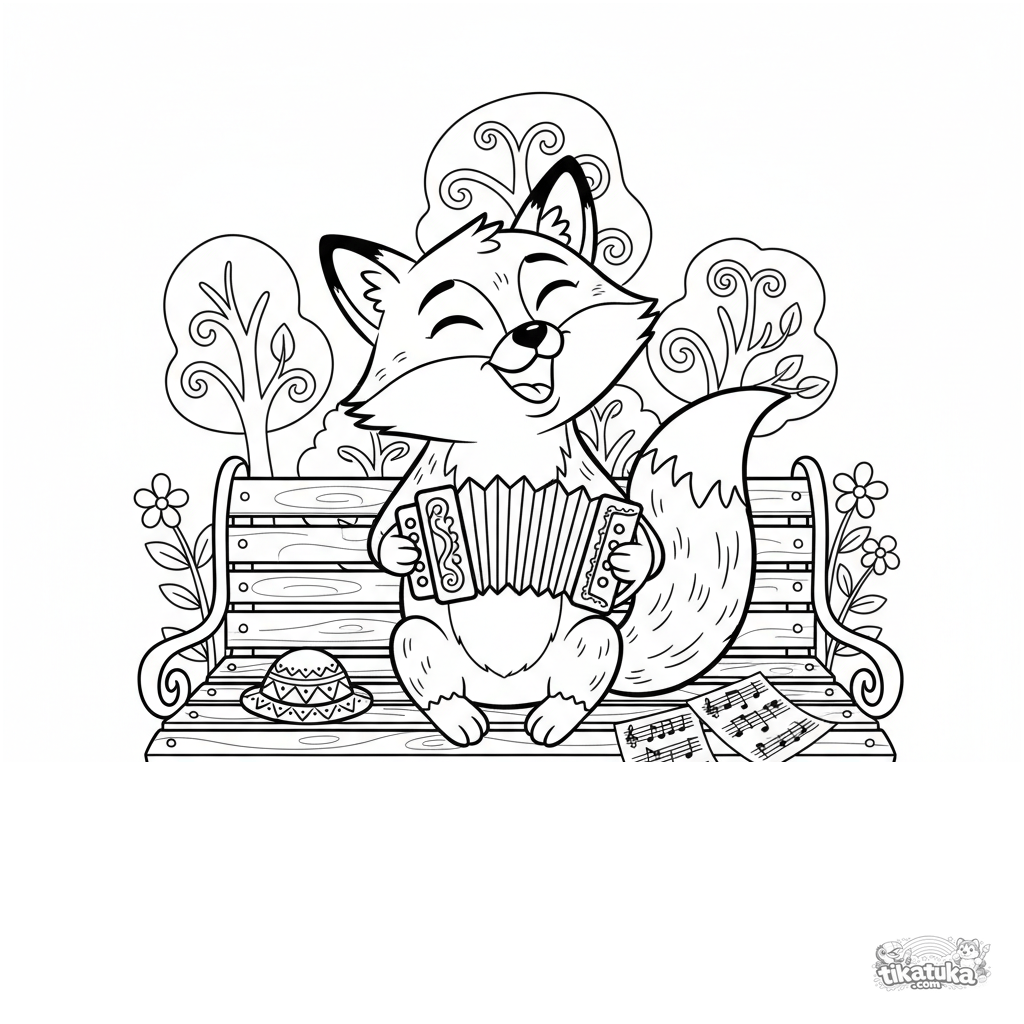 Раскраска для детей 10-12 лет: лиса в народном стиле играет на аккордеоне, сидя на парковой скамейке. Яркая, детализированная сцена с музыкой.
