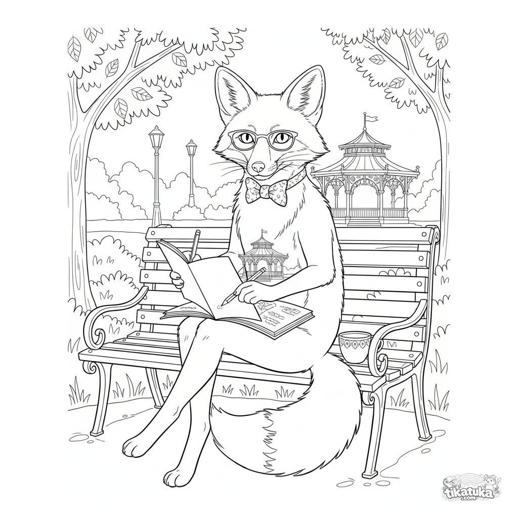 Детальная раскраска для детей 10-12 лет: лиса в очках рисует в скетчбуке, сидя на парковой скамейке. Реалистичный стиль с интересными элементами для раскрашивания.