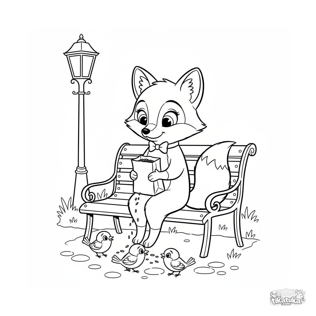 Раскраска для детей 4-6 лет: нарядный лис в бабочке кормит птиц с парковой скамейки. Элегантный стиль, воробьи и фонарь на заднем плане.