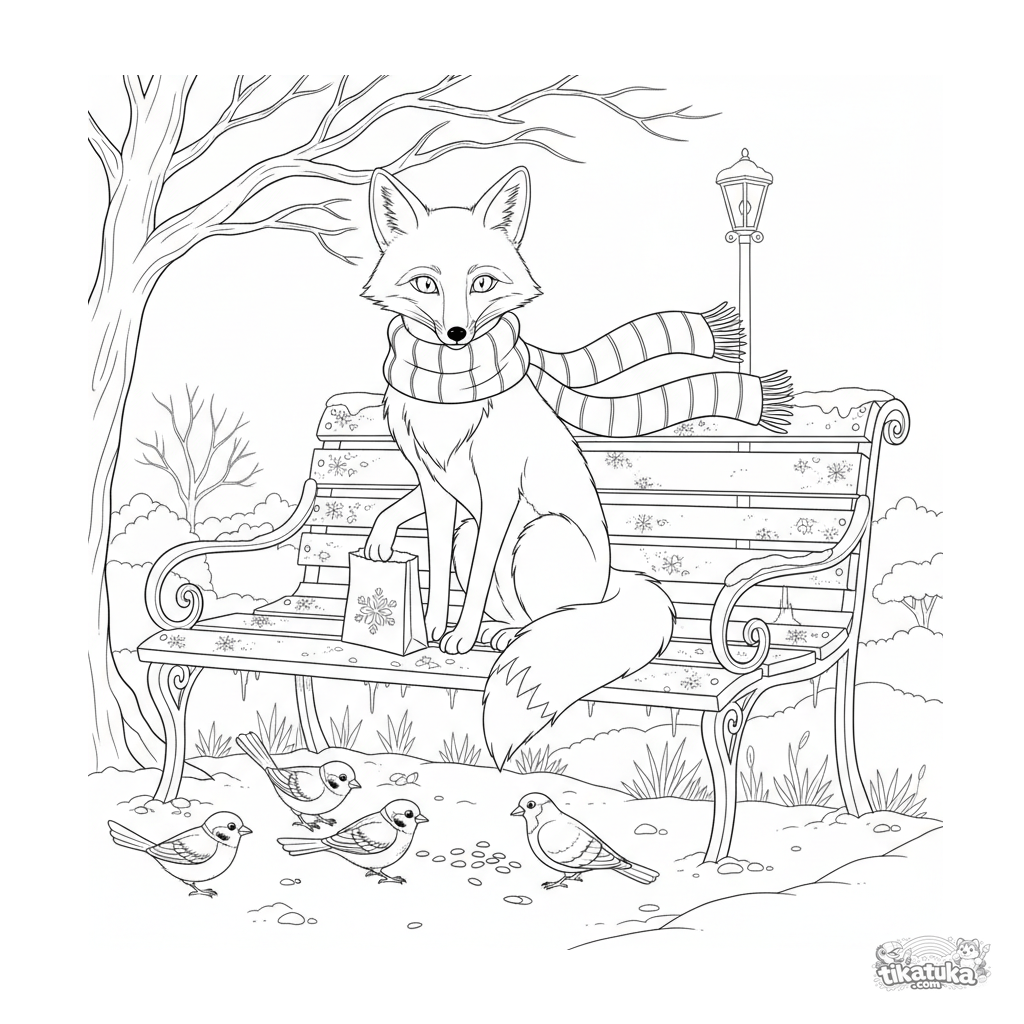 Детальная зимняя раскраска для детей 10-12 лет: лиса в шарфе кормит птиц на заснеженной парковой скамейке. Сцена доброты с реалистичными деталями.