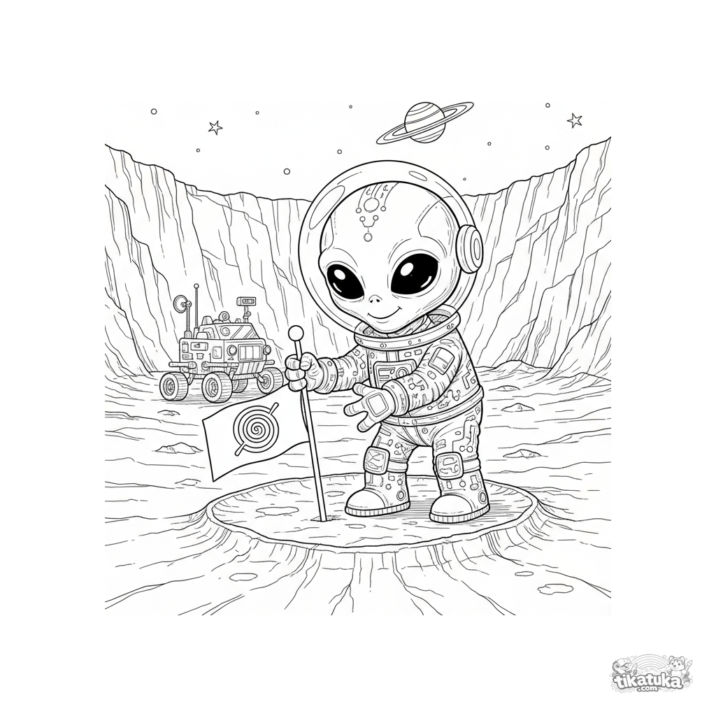 Сложная раскраска для детей 8-12 лет: дружелюбный инопланетянин устанавливает флаг на поверхности лунного кратера. Высокая детализация, реалистичный стиль.