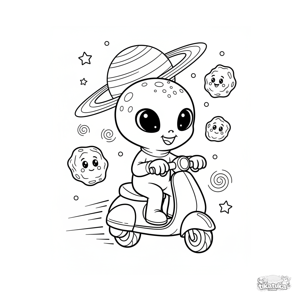 Раскраска с дружелюбным инопланетянином, который летает на скутере мимо кольцевой планеты и астероидов. Для детей 4-6 лет. Веселая космическая сцена для раскрашивания.