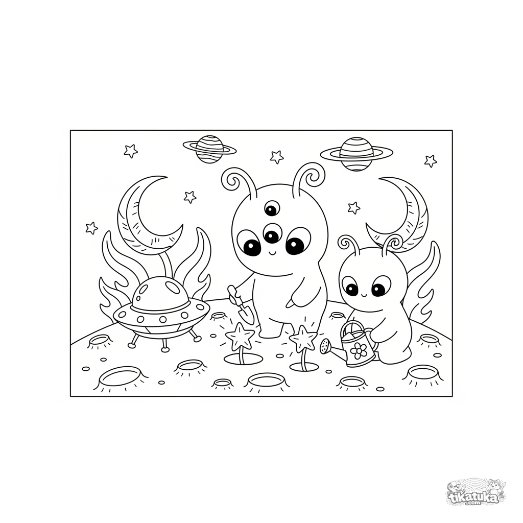 Раскраска для детей 4-6 лет на космическую тему: дружелюбная семья инопланетян сажает светящиеся семена на поверхности Луны. Милая и необычная сцена.