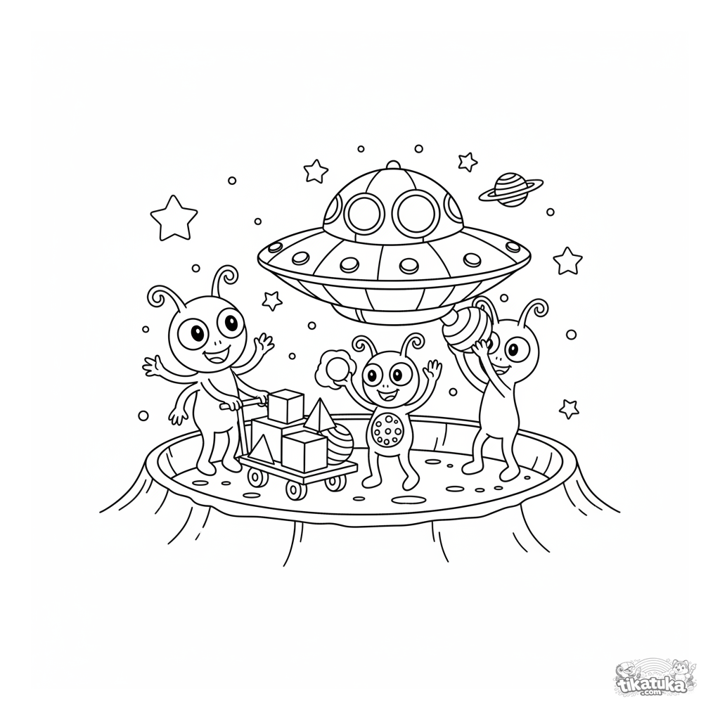 Раскраска с дружелюбной семьёй инопланетян, разгружающей свой корабль в лунном кратере. Для детей 4-6 лет, развивает фантазию о космосе.