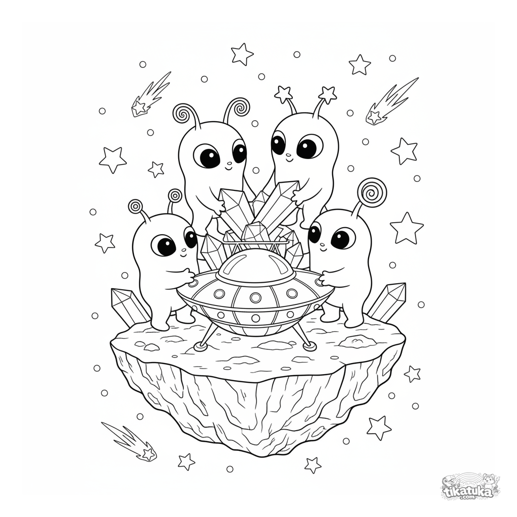 Сложная космическая раскраска для детей 7-12 лет: семья добрых пришельцев разгружает летающую тарелку на астероиде. Множество деталей и элементов.